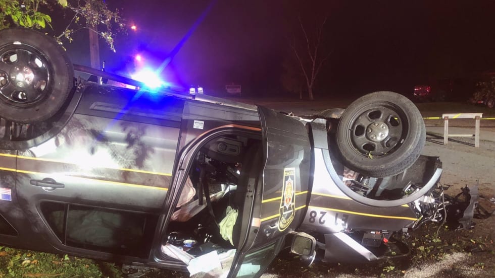 A burglary suspect who led Pennsylvania Troopers on a vehicle pursuit in Erie County over the weekend rammed at least one patrol vehicle, completely upending the SUV and causing injuries to the troopers inside, officials report.