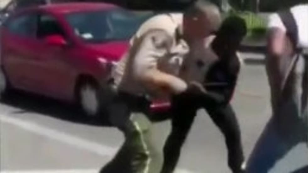San Jacinto High School had just let out when the officer started to break up a fight near campus. He was soon swarmed with students, and it appeared some of the students tried to pull off a boy who allegedly tackled the officer to the ground.