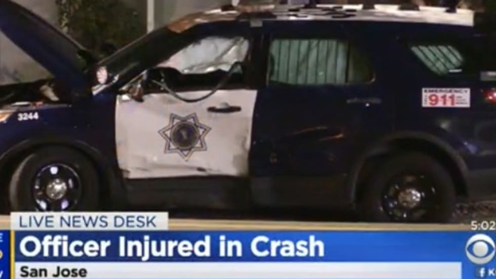 An officer with the San Jose (CA) Police Department was injured when a driver ran through a stop sign and slammed into his patrol car.