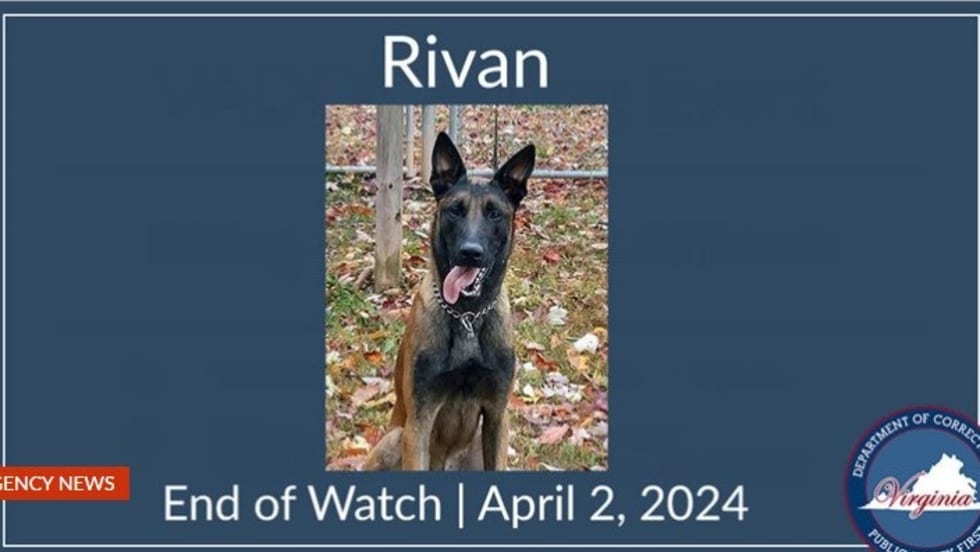 “(K-9) Rivan was violently and repeatedly stabbed and kicked by the inmates and later tragically died at the facility while VADOC staff attempted lifesaving measures,” the agency says.