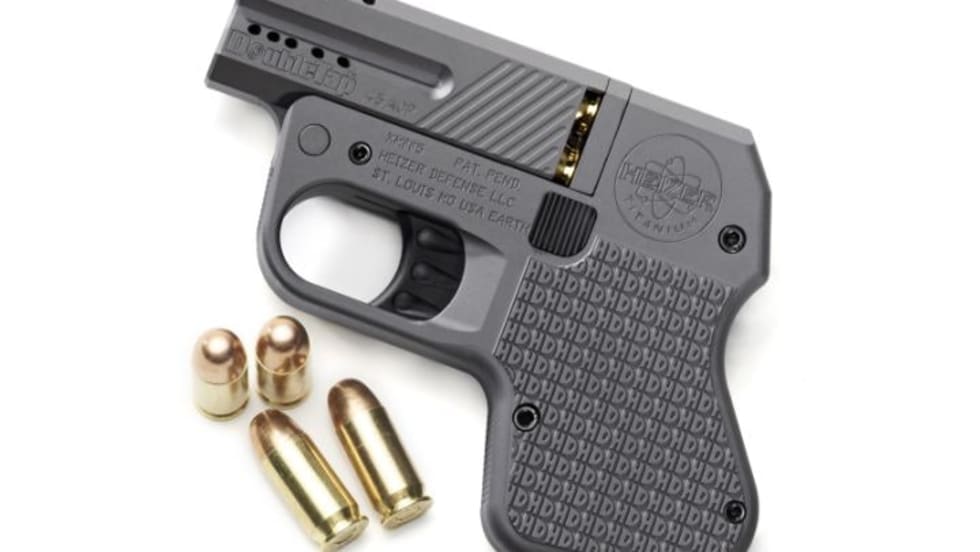 Heizer Defense has introduced the DoubleTap, a slim and light pocket pistol available in .45 ACP or 9mm with a four-round capacity. The pistol offers an unusual break-action feature and ambidextrous thumb latch controls. Heizer is touting the pistol's engineering and manufacture at an aerospace facility.