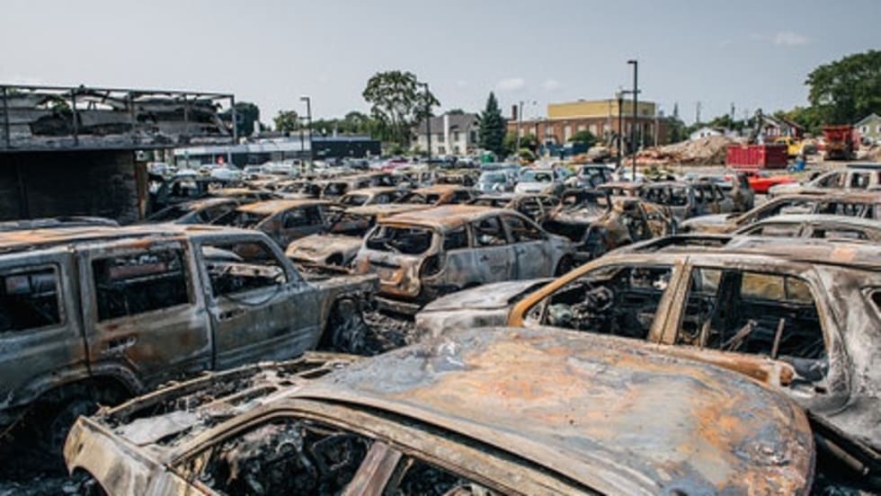 Damage in the downtown area of Kenosha was extensive. A car dealership and the vehicles on the lot were burned, businesses were looted, and even the public library was attacked.