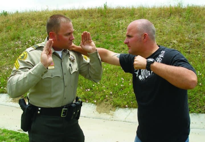 There are arguments for and against law enforcement officers using closed-hand punches. It can be better to avoid hitting a suspect with your bare knuckles so you don't injure your hands so you can't pull a trigger, hold a baton or continue striking with a broken hand. Here are four safer strikes—palm strike, bottom fist strike, knee strike and elbow strike—when dealing with a violent suspect. Our related article, "Safer Strikes," explains how to avoid bloodborne pathogens.