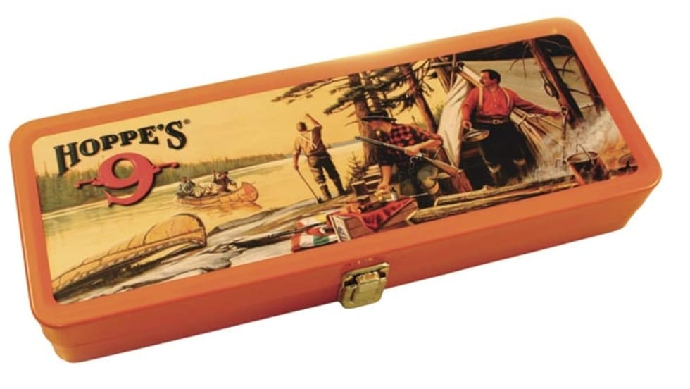 A new commemorative tin from Hoppe’s, now part of Bushnell Outdoor Accessories, includes everything a firearms owner needs to clean a gun. The scene on the front of the tin depicts a moose hunting camp from long ago and reminds many hunters of their first hunting camp where they might have used No. 9. Cleaning products in the tin include Hoppe’s No. 9 solvent, lubricating oil, and patches.