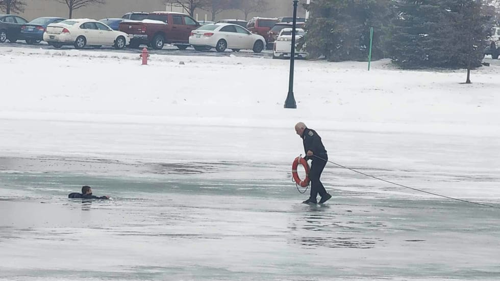 Dundee Commercial Motor Vehicle Officer Joe Schumaker took a floatation device out on the ice to the victim. Officer Schumaker fell through the ice but “continued wading out to complete the rescue,” Dundee PD said.