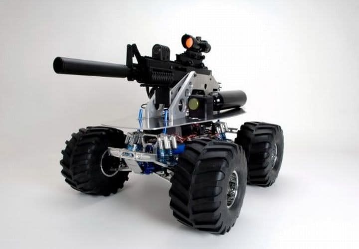 Read More →Designed for law enforcement missions involving rioters and hostages, the SWAT Bot Robotic Weapon is a first-person view, unmanned ground vehicle that allows a remote operator to record video in a hazardous environment. The SWAT Bot can travel at speeds of up to 50 mph with a wireless range of 500 feet. It features an M16-style less-lethal weapon that fires pepperballs, paintballs, and hardened rubber rounds. It's produced by InspectorBots.com.