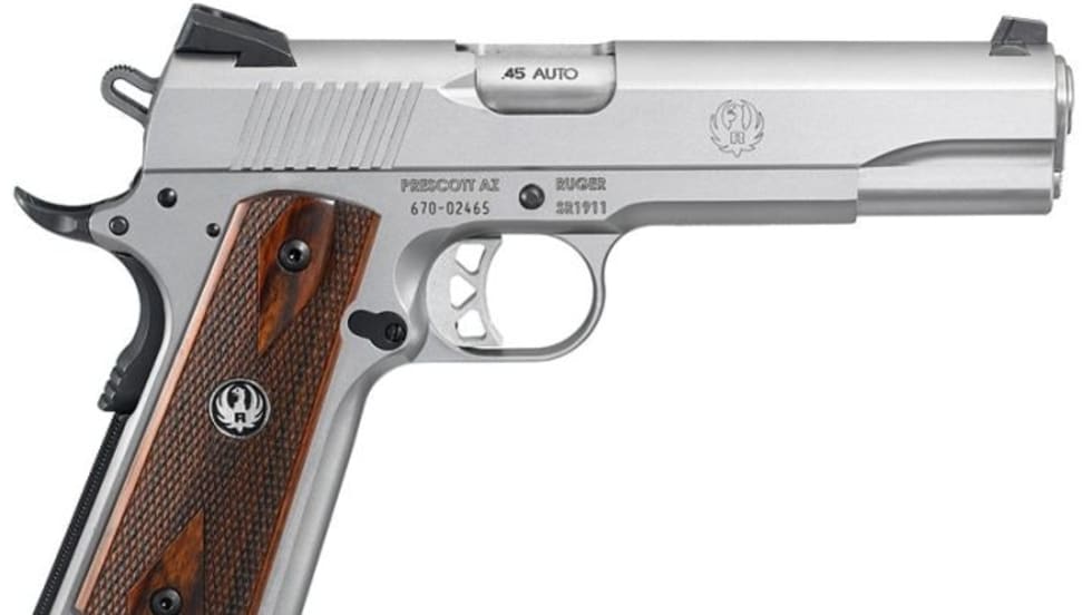 The single-action, .45-auto Ruger SR1911 arrives with a stainless steel slide, barstock frame, 5-inch barrel and bushing. The slide features rear cocking serrations and a dovetailed three-dot sight system with a Novak rear sight and standard front sight.