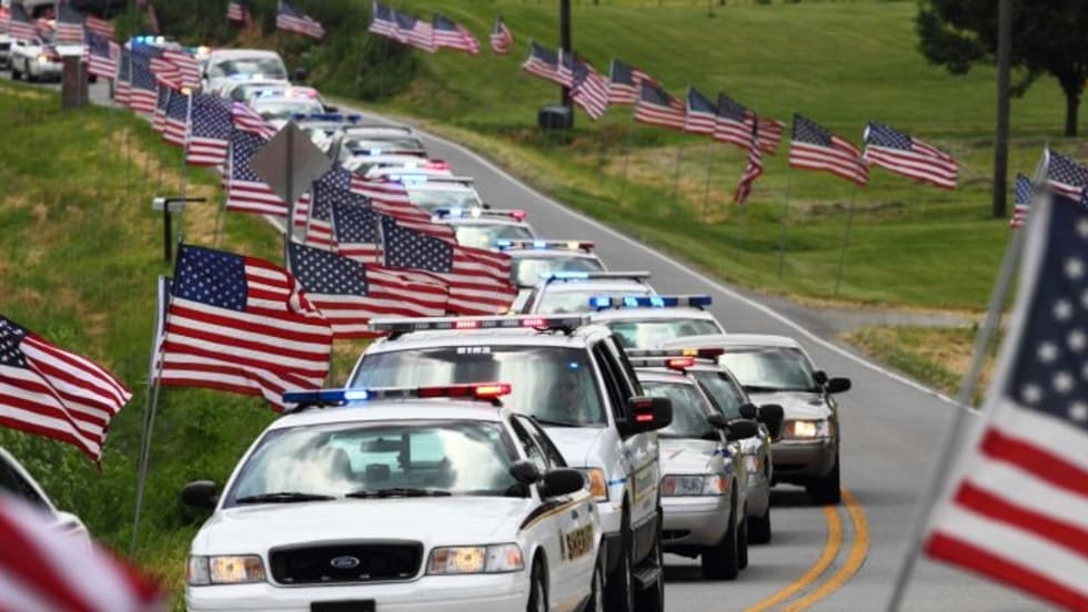Hundreds of law enforcement officers paid their respects to fallen Bardstown (Ky.) Police Officer Jason Ellis on May 30 during a memorial service. Officer Ellis' K-9, Figo, also paid his respects, keeping a vigil and resting his paw on the officer's casket. Read the full story here. Photos by Wales Hunter.