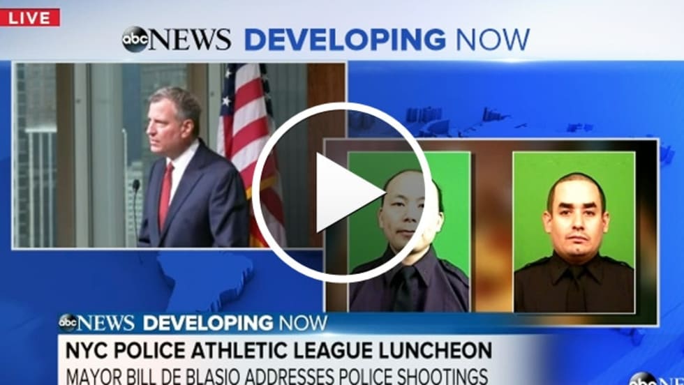 Mayor Bill de Blasio got a chilly reception from NYPD officers at Woodhull Hospital Saturday after two officers were shot to death in Brooklyn.