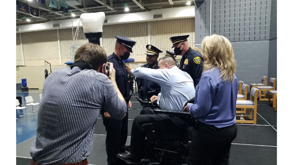 Officer Ronny Cortez and his partner were shot in the line of duty after confronting a burglary suspect in 2017. One bullet pierced his spine and left him paralyzed and in a wheelchair.