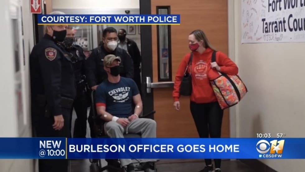 Officer Joshua Lott was released from JPS Hospital in Fort Worth at 6 p.m. Thursday, about 38 hours after he was shot in the neck, just below the shoulder, and in the chest.