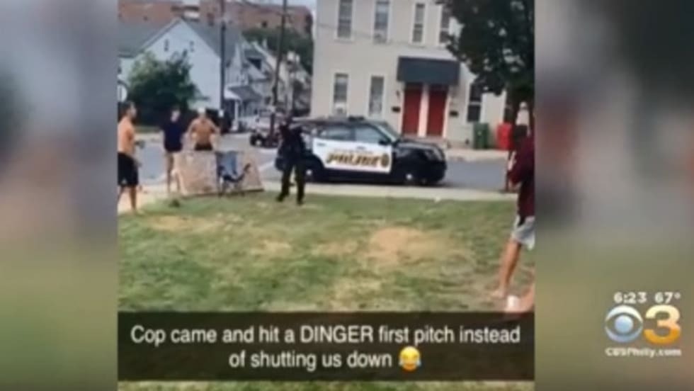 An officer with the Bethlehem Police Department decided to join some students playing a pick-up baseball game on a lawn near the Lehigh University campus, hitting a bomb of a home run on the very first pitch he saw.