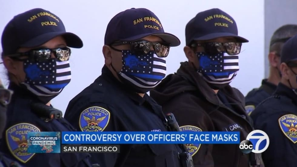 The chief of the San Francisco Police Department has banned the use of facial masks that bear the pattern of the "Thin Blue Line" flag during the COVID-19 pandemic .
