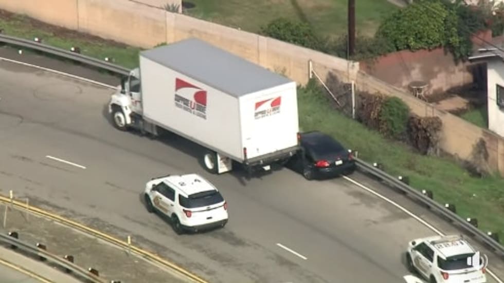 Three suspects fleeing police after a residential burglary attempted to navigate their vehicle between the right shoulder barrier and a box truck in the right-hand lane of a Southern California freeway and found themselves pinned between the two immovable objects.
