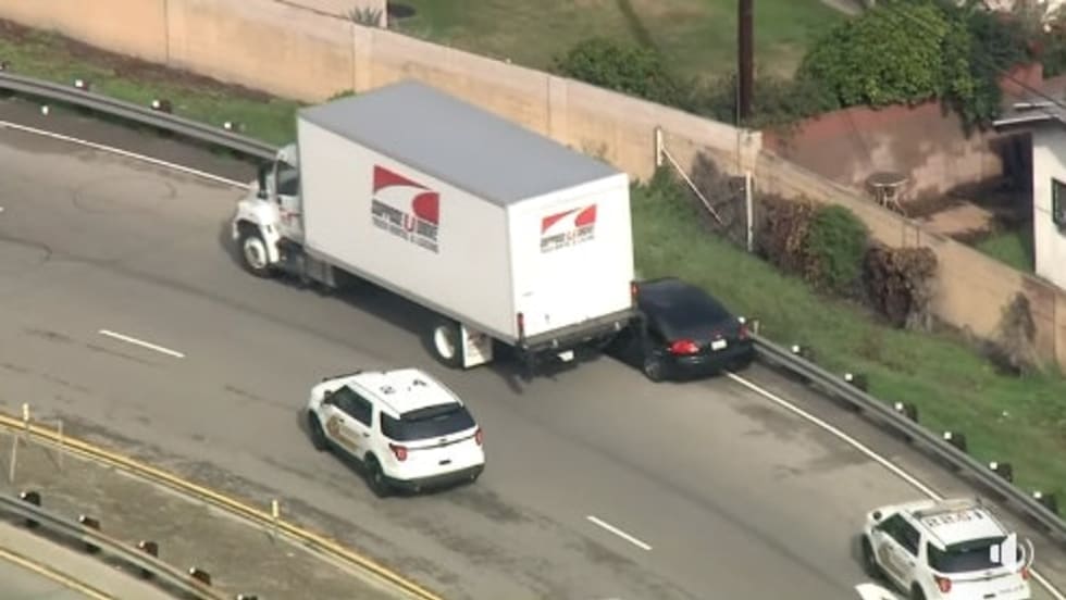 Three suspects fleeing police after a residential burglary attempted to navigate their vehicle between the right shoulder barrier and a box truck in the right-hand lane of a Southern California freeway and found themselves pinned between the two immovable objects.