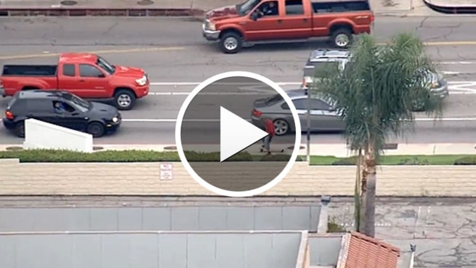 A suspect wanted for allegedly stealing a BMW sedan led police on a chase in Van Nuys, Calif., bailed out on foot and attempted to get away on a skateboard before he was blocked by a good Samaritan in a pickup truck as officers arrived.