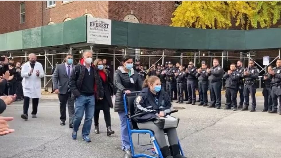 Officer Alejandra Jacobs, 23, was greeted by a hundred clapping fellow officers — and Mayor-elect Eric Adams — as she was wheeled out of St. Barnabas Hospital shortly before noon, wearing a Patrolmen’s Benevolent Association jacket.