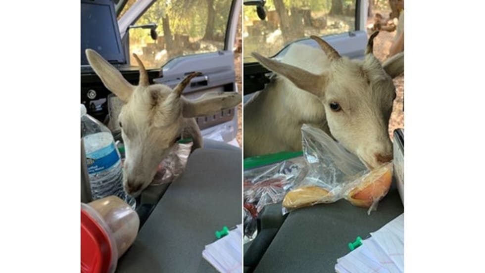 The Nevada County Sheriff's Office playfully posted images to social media over the weekend of a goat eating a deputy's snacks in the front passenger seat of his patrol vehicle.