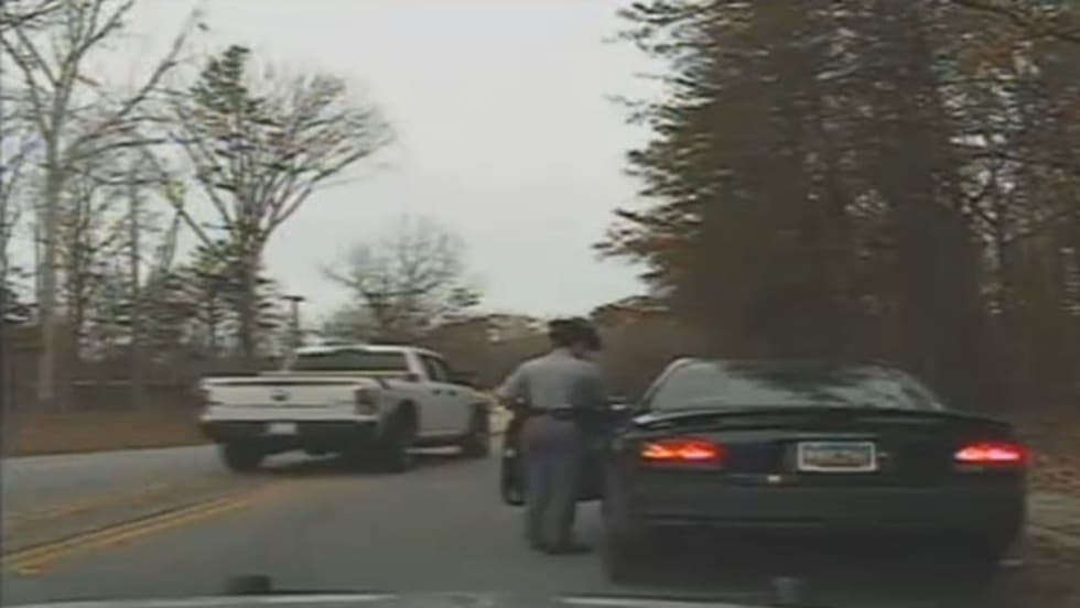 The trooper was able to make it back to her patrol car and pursue Saunders, who was arrested after she used a PIT maneuver to crash his vehicle on a two-lane road.