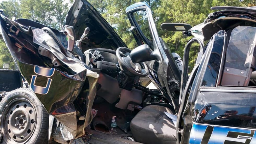 A deputy with the Chester County (SC) Sheriff's Office was injured when a tree truck crashed into his patrol vehicle at an intersection on Saturday morning.