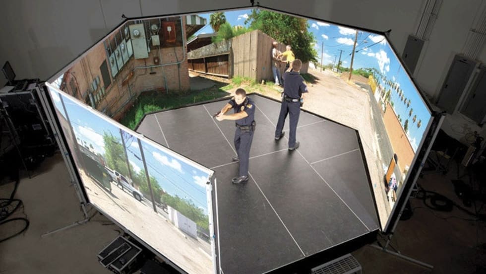 VirTra's V-300 is designed for decision-making simulation and tactical firearms training. Five screens and a 300-degree immersive training environment ensure that time in the simulator translates into real world survival skills.