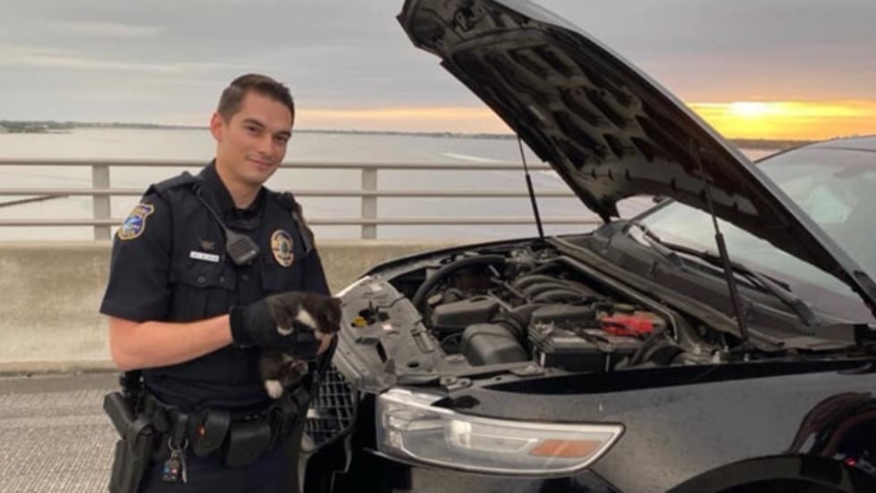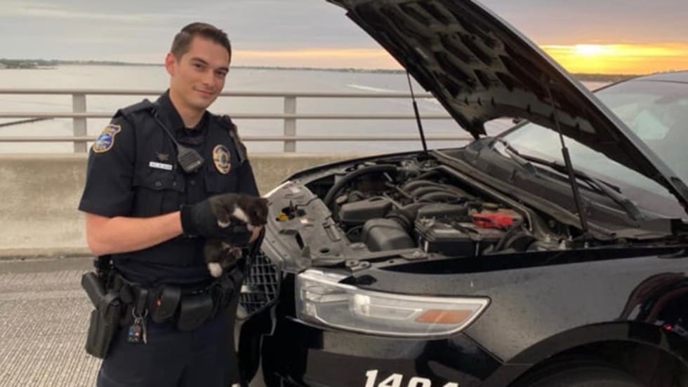 A police sergeant with the Stuart (FL) Police Department has adopted a little kitten that had been rescued by an officer after the little feline sought a hiding spot in the engine compartment of a patrol vehicle.