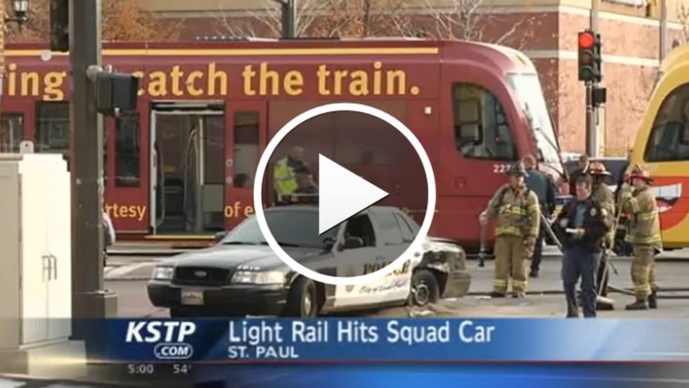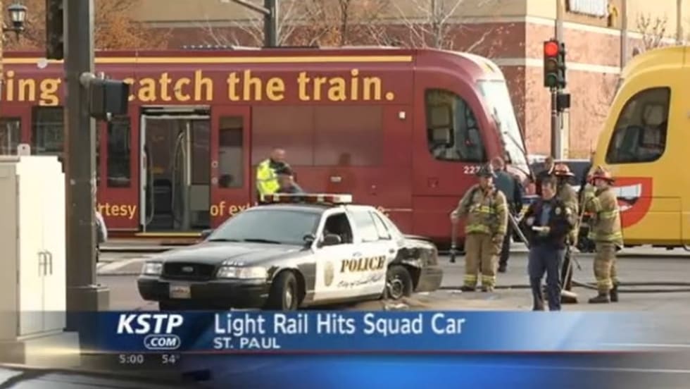 A St. Paul, Minn., police squad car traveling with its lights and sirens was hit by a Green Line light rail train Monday afternoon in St. Paul. More Here.