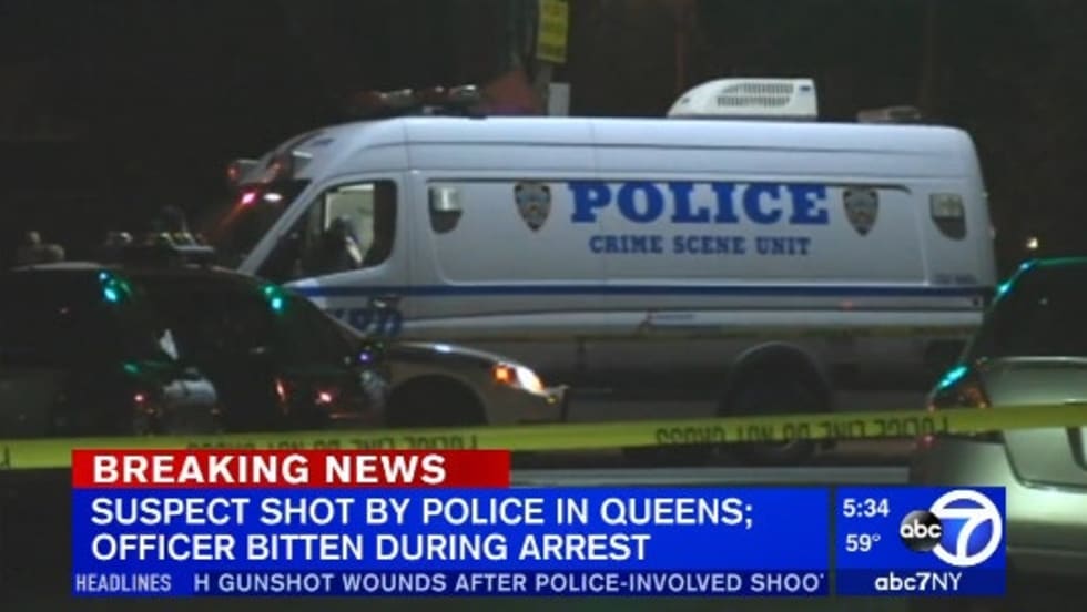 A man with a gun was shot in the leg by police and the suspect bit an NYPD officer during an attempted traffic stop in Queens Village late Wednesday.