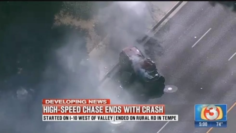 The chase lasted for nearly an hour and came to a violent end when the suspect slammed into another car on Rural just south of Apache, spinning out in a cloud of flying metal and billowing smoke.