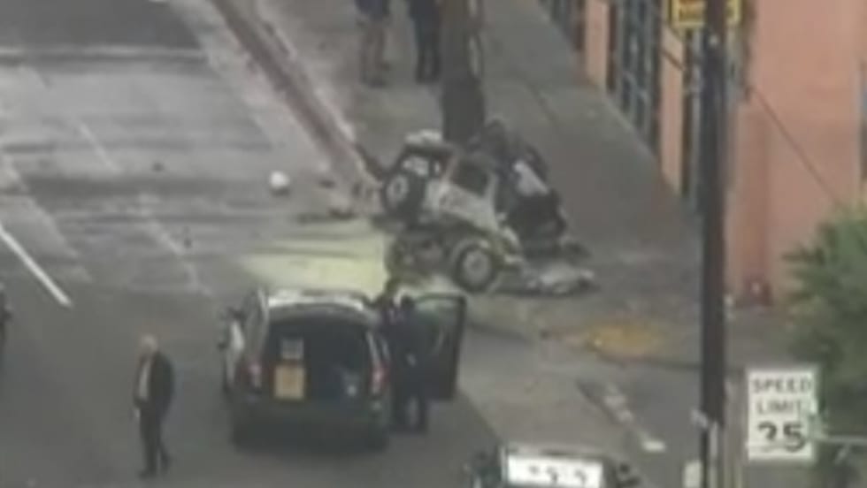 Aerial video from KTLA showed a Jeep-like SUV had apparently crashed into a power pole and was totaled; about a dozen police vehicles were on scene.