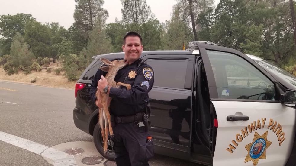 The California Highway Patrol in Redding posted to its Facebook page a message showing images of CHP San Francisco Sergeant Fawson receiving a wet kiss from the one-month old fawn he rescued from a wildfire.