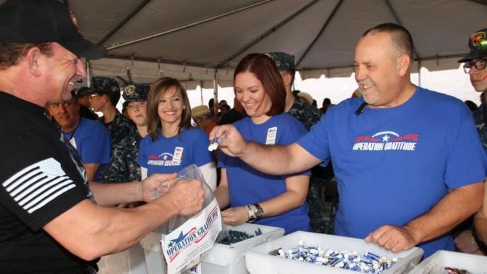 As California Highway Patrol lights and sirens heralded the moment, more than 2,100 Operation Gratitude volunteers of all ages and from all walks of life cheered the production of the organization's two millionth care package Tuesday.