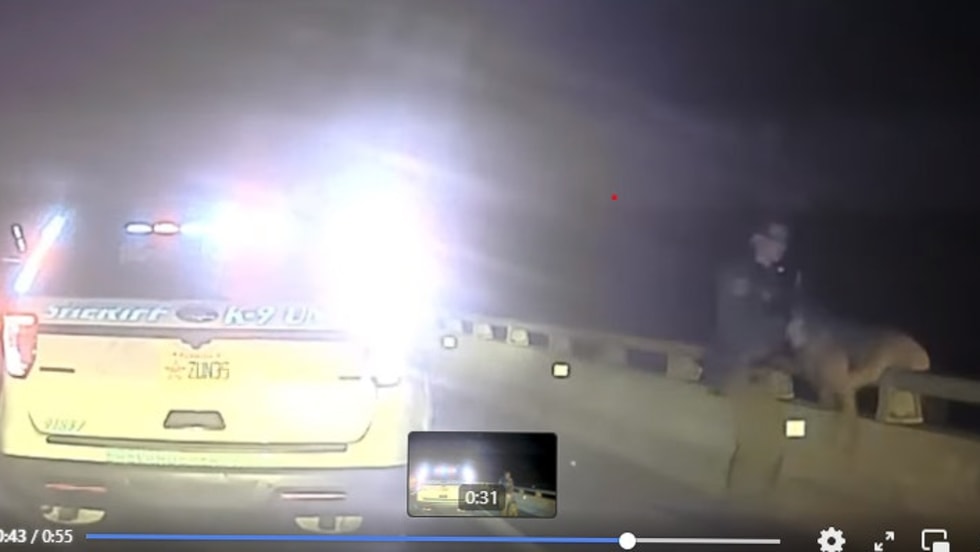 Brevard County Sheriffs deputy holds tight to partner's leash and pulls dog to safety.