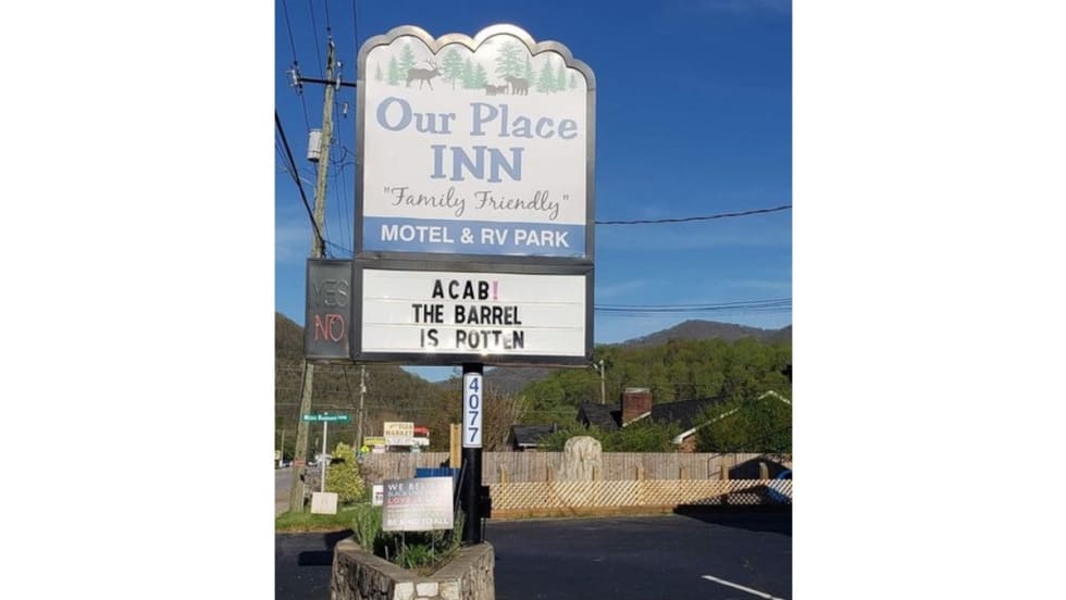 The message: “ACAB! The Barrel is Rotten” was posted days ago on a sign in front of the Our Place Inn, and later shared on its Facebook page.