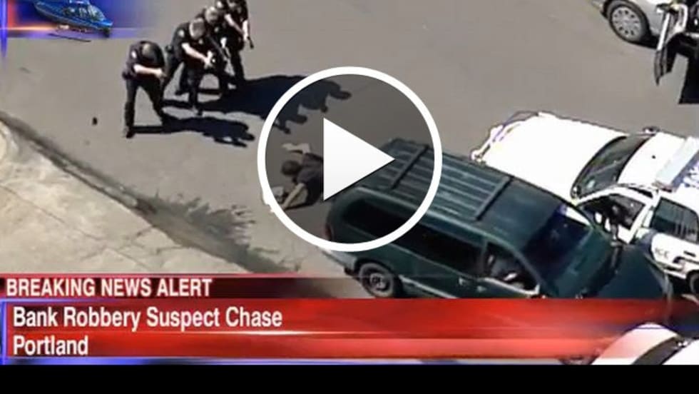 Portland Police Bureau officers credited a local television news helicopter with helping them apprehend a bank robbery suspect, after officers had broken off a high-speed pursuit.