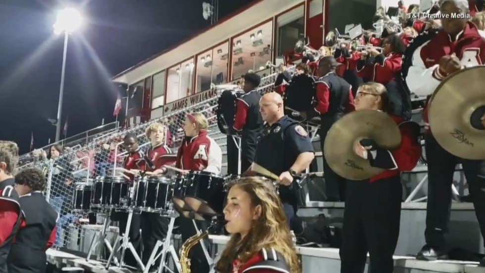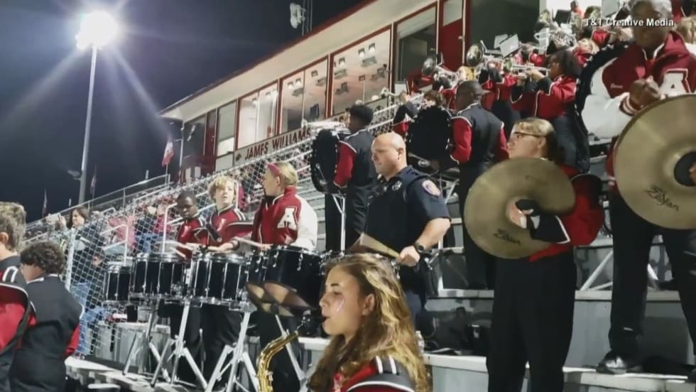 Corporal Les Munn of the Texarkana (AR) Police Department is not one to shy away from a challenge. So when a high school student lugging her drums up the bleachers laid down the gauntlet that the officer help the band perform, he accepted the dare.