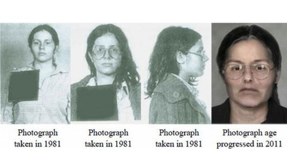 The age-processed photo, which is based on 1981 booking photos, depicts what Donna Joan Borup could look like in 2011. Borup is wanted for allegedly tossing an acidic substance into the eyes of Port Authority Police Officer Evan Goodstein at a 1981 demonstration.