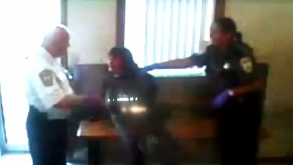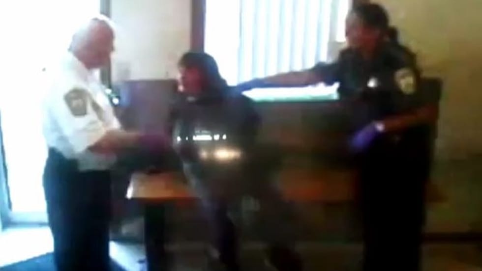 The video shows Sgt. Brad McCaslin using a stun gun twice to the back of an arrested and handcuffed woman's neck after she refused to sit down in the booking room. Interim police Chief Tom Fearn then entered the room and shook the woman by the neck several times, after she appears to yell at him.