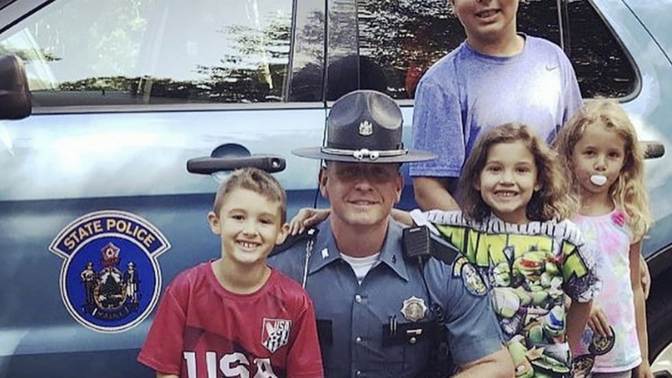 A Maine State Police trooper was reunited for the first time in six years with four children he stood guard over while police searched for their mother’s killer.