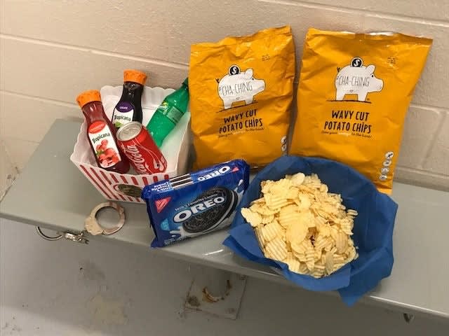 Photos of a holding cell stocked with Oreos, Coca-Cola and Cha-Ching wavy potato chips in a bowl accompanied the post. A pair of handcuffs was casually placed next to the Oreos.