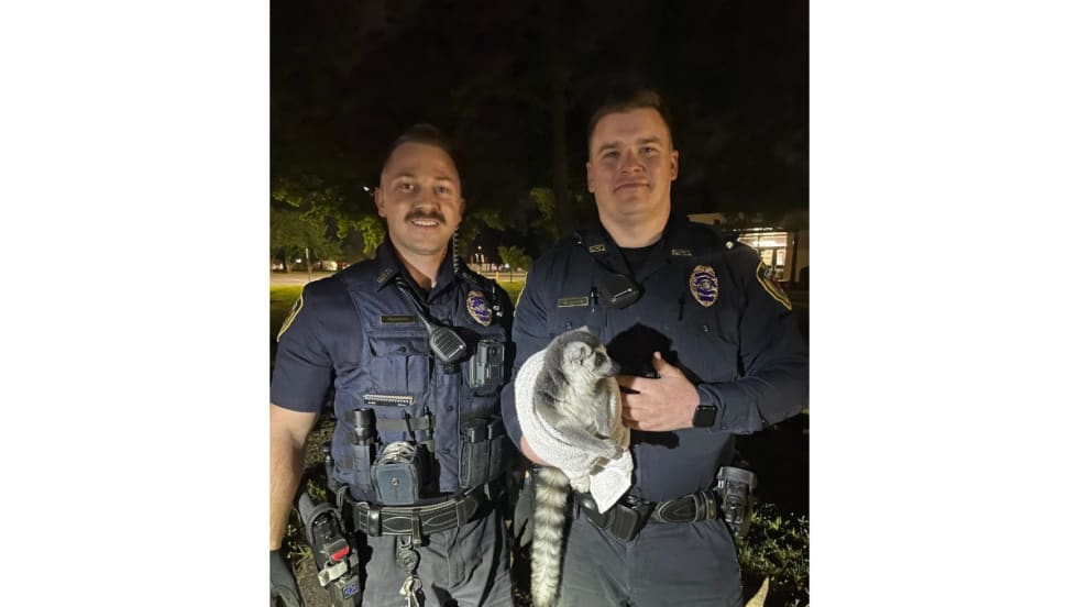 After multiple attempts to snag the speedy primate. One of the officers trapped it in a towel.