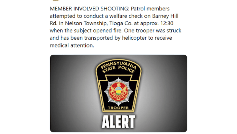 A Pennsylvania state trooper was shot and wounded Tuesday afternoon by the subject of a welfare check and had to be airlifted from the scene.