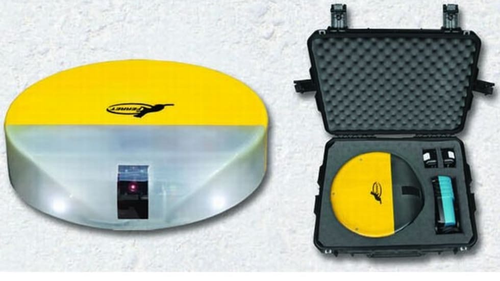 The Ferret is a mobile robot camera that moves under low-profile vehicles. It features a movable color video camera with on-board lighting. The Ferret, which can operate day or night, sees up and around drive shafts and deep into wheel wells.
