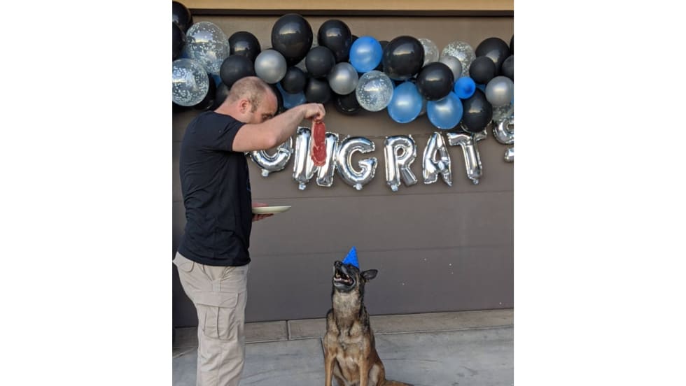 K-9 Paige with the Hurricane City (UT) Police Department has bid farewell to two-legged colleagues at the department during a sendoff celebration at which she was given a large steak instead of cake.