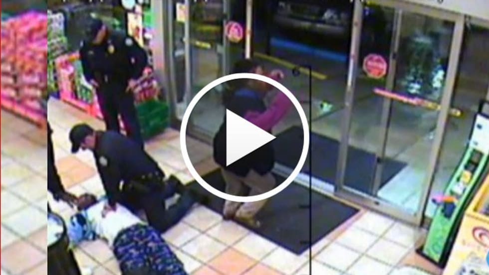 A Forest Park (Ga.) Police officer helped revive a passed-out man on the floor of a convenience store, as the man's mother nervously paced around him.