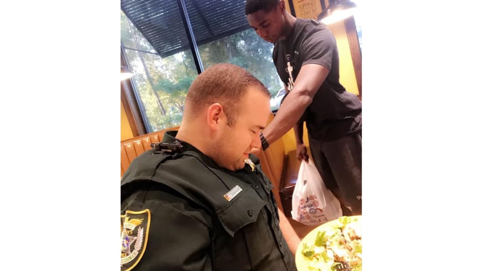 An image posted to social media of a young man laying his hand on the shoulder of a seated police officer and saying a silent prayer for him has gone viral on the Internet.