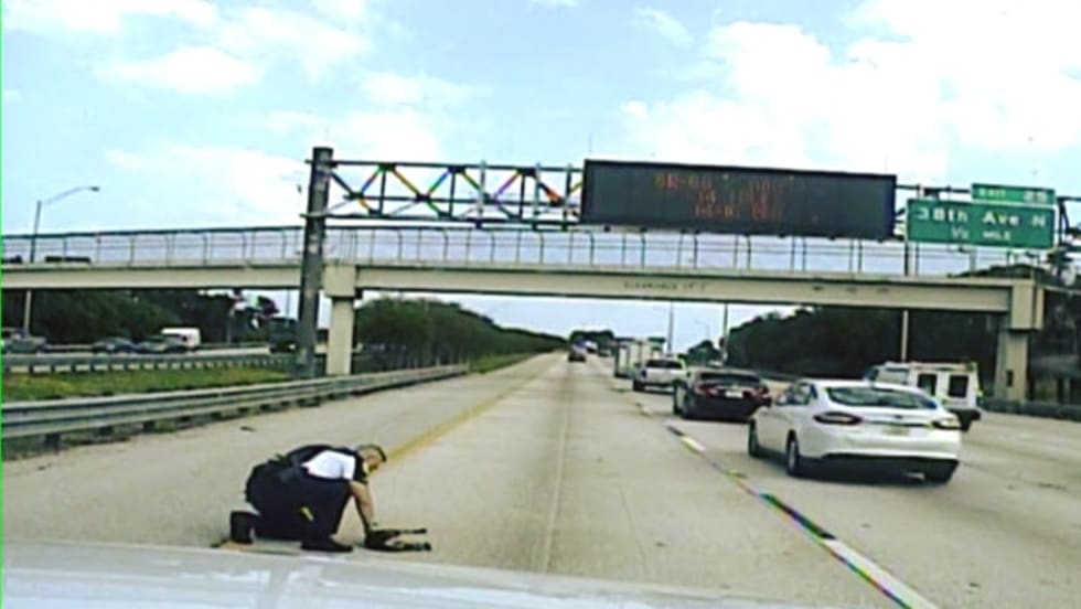 An officer with the Pinellas Park (FL) Police Department who witnessed a small dog being struck by a vehicle on an interstate freeway swooped to the animal's aid, wrapping it in a blanket and delivering it to a nearby veterinary hospital.