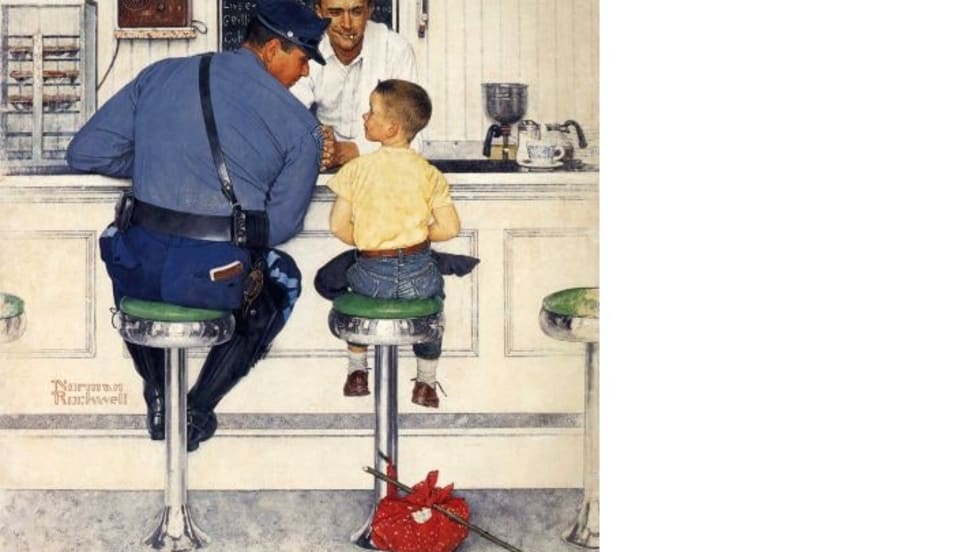 Richard Clemens was a 29-year-old trooper when Rockwell asked him to pose for the painting. Rockwell showed him leaning down toward the boy with a red knapsack on the floor behind him.