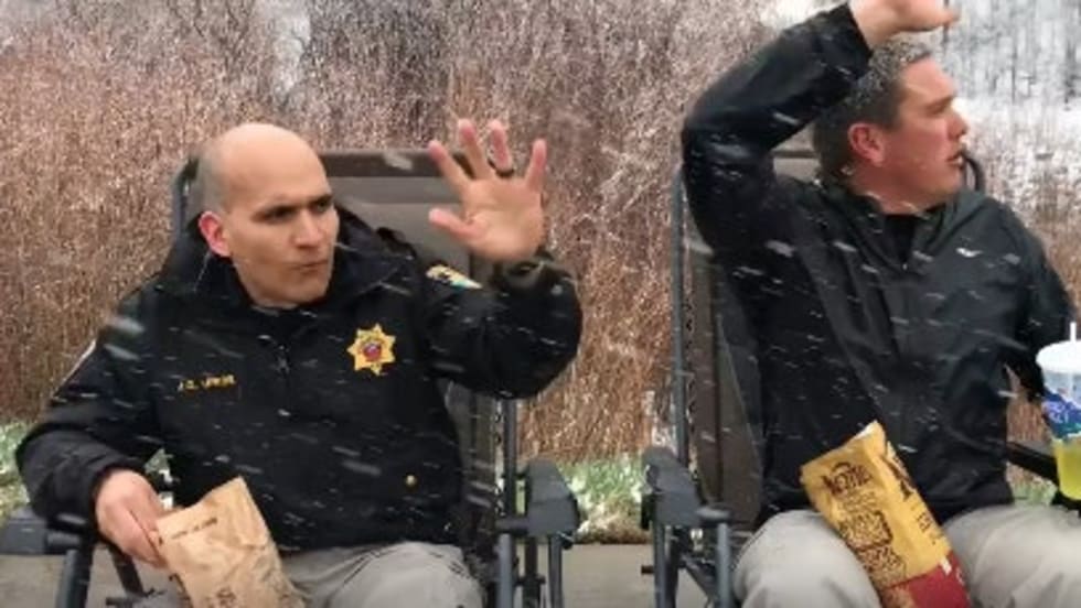 Two deputies with the Douglas County Sheriff's Office were seen in an amusing video sitting in lawn chairs and eating snacks beside the road of a freeway in their jurisdiction that tends to have foul-weather traffic collisions.
