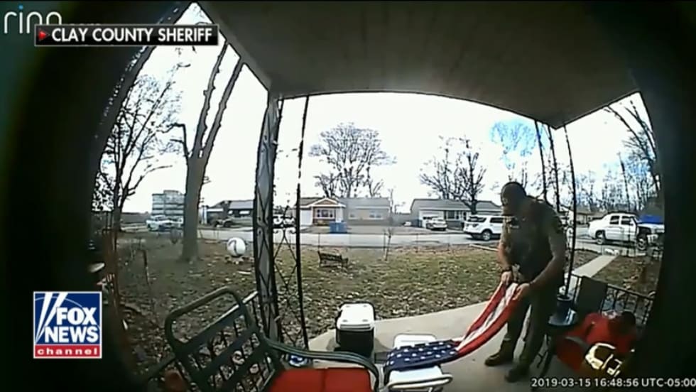 A deputy with the Clay County (MO) Sheriff's Office was seen on doorbell camera video rescuing an American flag that had fallen to the ground in a windstorm, folding it properly into a ceremonial triangle.